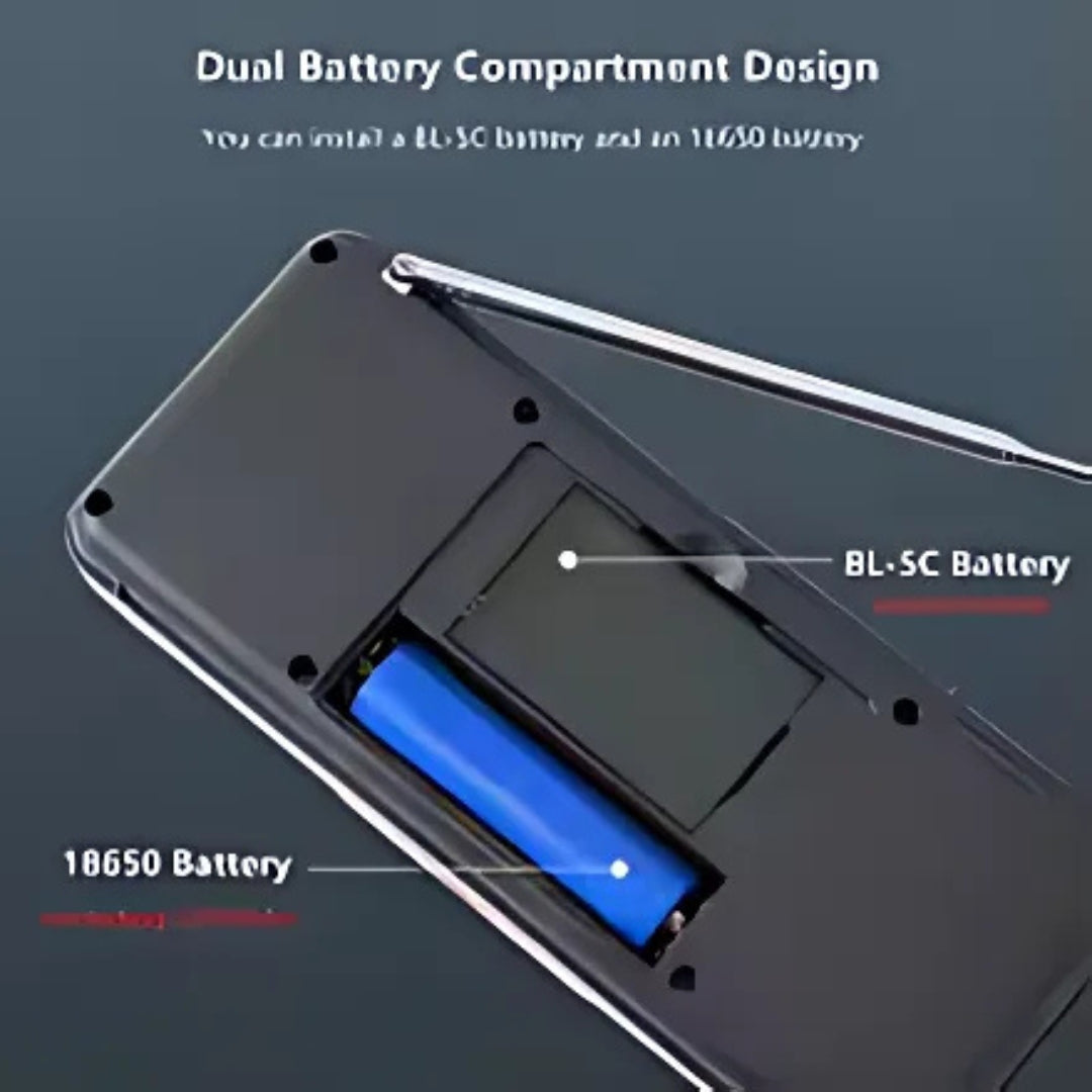 Funciona com bateria 18650 ou BL-5C. Vai com uma 18650 de 1200mAh incluída — autonomia de até 8 horas!